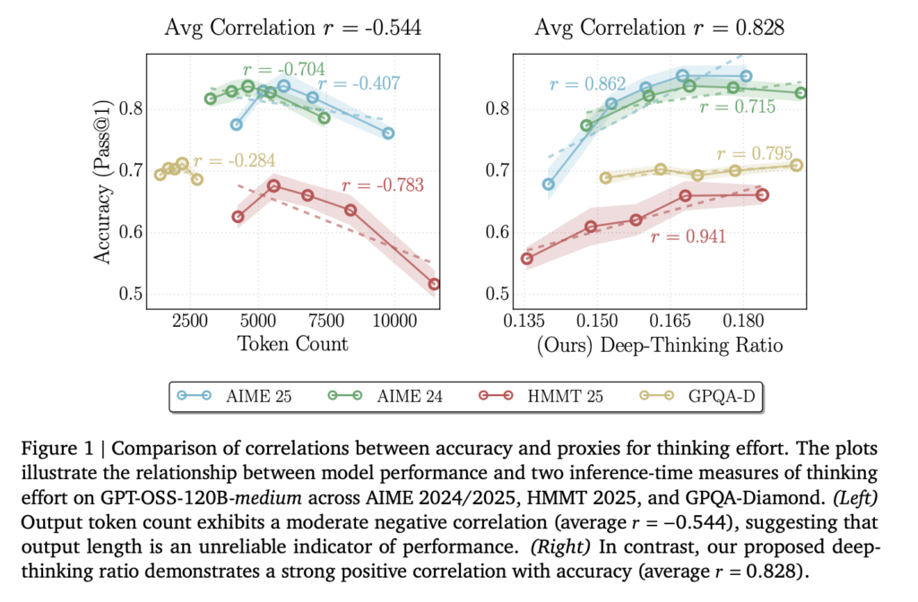The Deep-Thinking Ratio (DTR) is the percentage of these ‘hard’ tokens in a full sequence. Across models like DeepSeek-R1-70B, Qwen3-30B-Thinking, and GPT-OSS-120B, DTR showed a strong average positive correlation of r = 0.683 with accuracy.