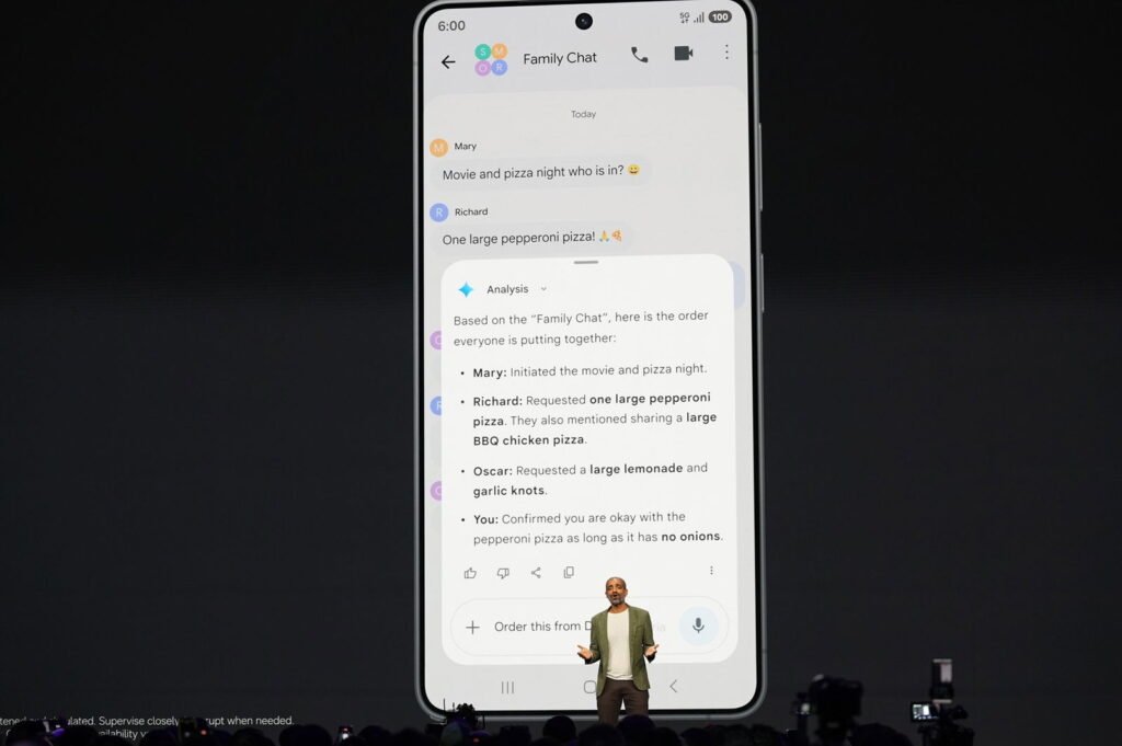 Onstage, Sameer Samat, Google’s president of Android, showed off a demo of how Gemini’s new agentic features would work to help wrangle a pizza dinner order from his busy family group chat. Samat asks Gem …