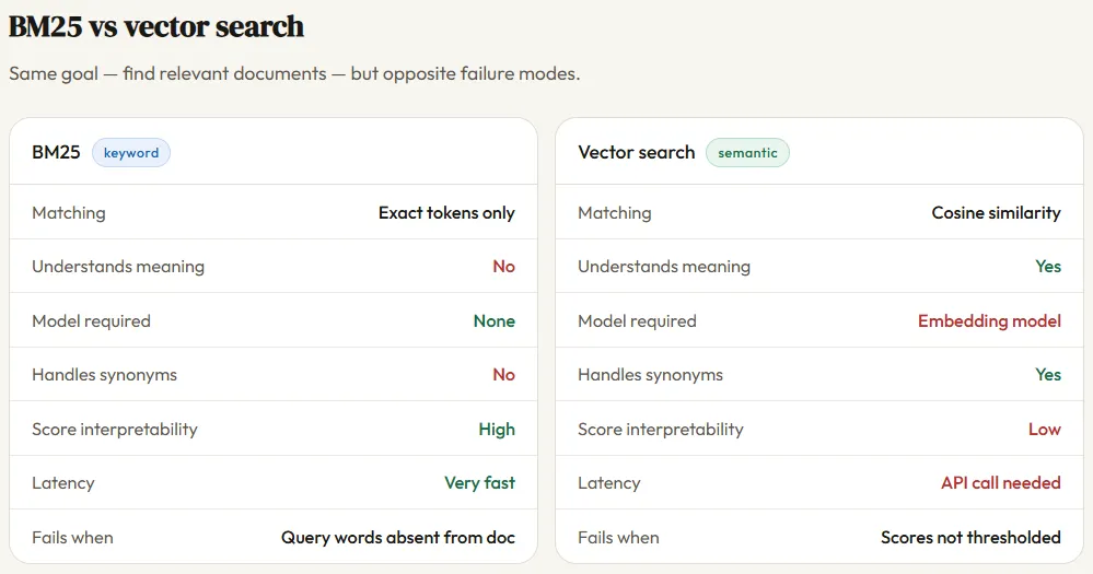 The tradeoff is practical: BM25 requires no model, no GPU, and no API call — it’s fast, lightweight, and fully explainable. Vector search requires an embedding model at index time and query time, adds latency and cost, and produces scores that are harder to interpret. Neither is strictly better; they fail in opposite directions, which is exactly why hybrid search — combining both — has become the production standard.