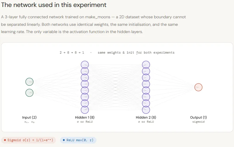 In this article, we focus on this forward-pass behavior — analyzing how Sigmoid and ReLU differ in signal propagation and representation geometry using a two-moons experiment, and what that means for inference efficiency and scalability.